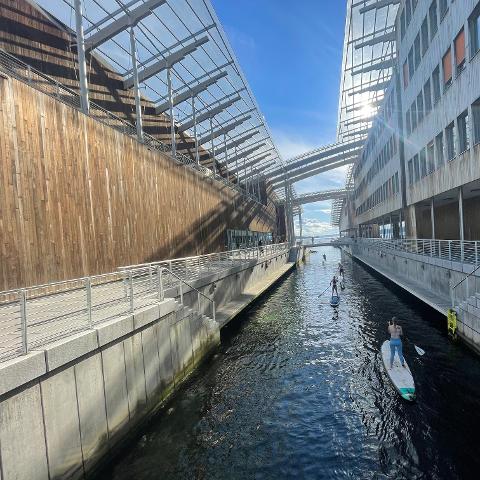 Rent a stand-up paddleboard for 1 - 5 hours and paddle around Tjuvholmen, Aker Brygge and the Oslo waterfront.